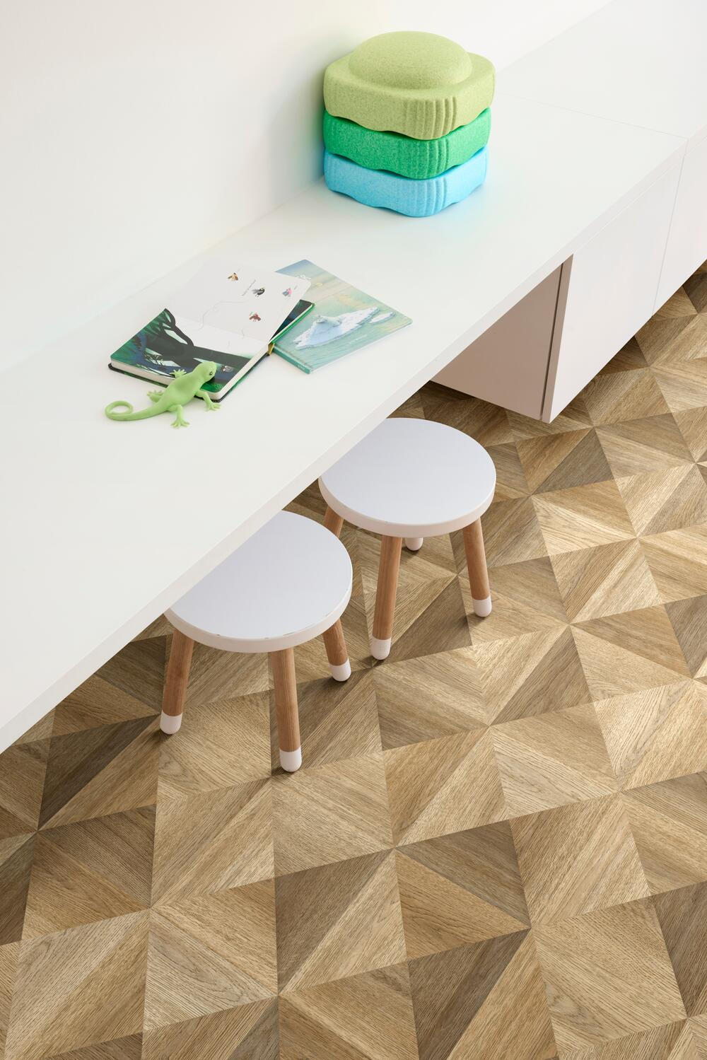Gama prezintă modele unice, inclusiv modele complexe de parchet, imprimeuri de țiglă și așchii de piatră. Fiecare dintre modelele prezentate a prins de mult timp rădăcini în interioarele rezidențiale și este perfect adaptat la curățarea în umezeală și la utilizarea covoarelor. Utilizatorii remarcă faptul că podeaua nu este alunecoasă și este foarte plăcută la atingere, fără a se teme de ghearele animalelor de companie sau de murdăria abundentă.